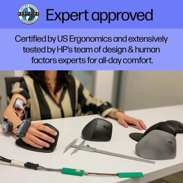 Keep your shoulder, neck, and forearm more relaxed throughout the day with the HP 920 Ergonomic Vertical Mouse. With its ergonomic upright form factor, the HP wireless mouse with detachable wrist rest is designed to keep your hand in a natural upright position as you click, drag, and scroll--whether you're working on a project, editing photos, or multi-tasking. This wireless vertical mouse gives you the freedom to work anywhere with its sensitive, multi-surface sensor that tracks on virtually any surface (2), even marble, so you never miss a click.