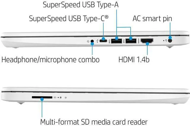 Memory & StorageThe PC memory has been upgraded to 8GB DDR4 SDRAM for enhanced high bandwidth to easily switch back and forth between open applications; Hard drive has been upgraded to 64GB eMMC for fast boot up and speedy data transfer ^^ ProcessorIntel Celeron N4120 Processor (4 Cores, 4 Threads, Base Frequency at 1.1GH z, Up to 2.6GH z at Max Turbo Frequency), with Intel UHD Graphics 600 ^^ Screen14" diagonal, HD (1366 x 768), micro-edge, BrightView, 220 nits, 45% NTSC ^^ Tech Specs1 x USB Type-C, 2 x USB 3.1 Type-A, 1 x HDMI, 1 x Headphone/Mic Combo, 1 x AC smart pin, SD Card Reader; Wi-Fi & Bluetooth; Windows 11 Home