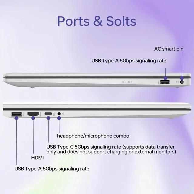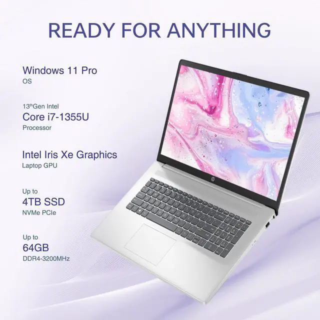 High Speed RAM And Enormous Space16GB DDR4 RAM to smoothly run multiple applications and browser tabs all at once; 1TB PCIe NVMe M. 2 Solid State Drive allows to fast bootup and data transfer ^^ ProcessorIntel Core i7-1355U (10 Cores, 12 Threads, 12MB L3 Cache, 1.2GH z base frequency, up to 4.6GH z max turbo frequency), with Intel Iris Xe Graphics ^^ Display 17.3" diagonal, FHD (1920 x 1080), IPS, anti-glare, 250 nits ^^ Tech Specs1 x USB Type-C 5Gbps signaling rate (supports data transfer only and does not support charging or external monitors), 2 x USB Type-A 5Gbps signaling rate, 1 x AC smart pin, 1 x HDMI 1.4 b, 1 x headphone/microphone combo, Backlit Keyboard, Fingerprint Reader, Wi-Fi 6 & Bluetooth ^^ Operating SystemWindows 11 Pro - Organize open apps with pre-configured layouts to optimize productivity, Navigate with more intuitive experience to get things done, Collaborate with teams with more features