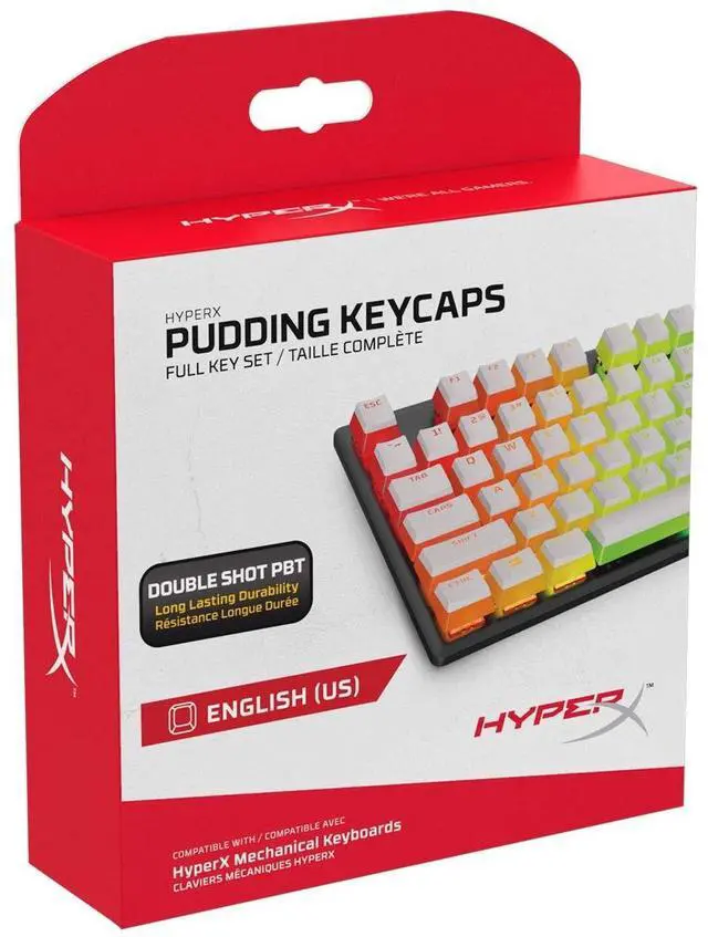 HyperX Pudding Keycaps feature a dual-layer style and our signature HyperX font both designed to let more light escape for extra brilliance. These PBT keycaps are thicker, more durable, and more resistant to solvents. HyperX Pudding Keycaps are compatible with HyperX and most other mechanical gaming keyboards and come with a stylish HyperX keycap removal tool for easy installation.