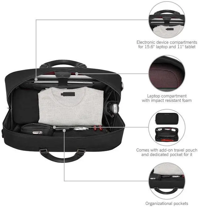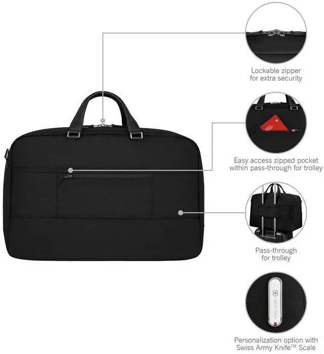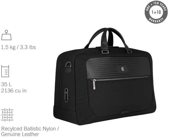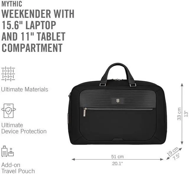 The Mythic Weekender combines functionality and quality. Its exterior features protective feet, an interlocking zipper with a leather pull and a luggage cart pass-through with a scratch-resistant pocket for easy access. The interior includes padded compartments for a 15.6 '' laptop and an 11'' tablet, along with multiple organized pockets for pens and essentials. Stay well-equipped for any journey.