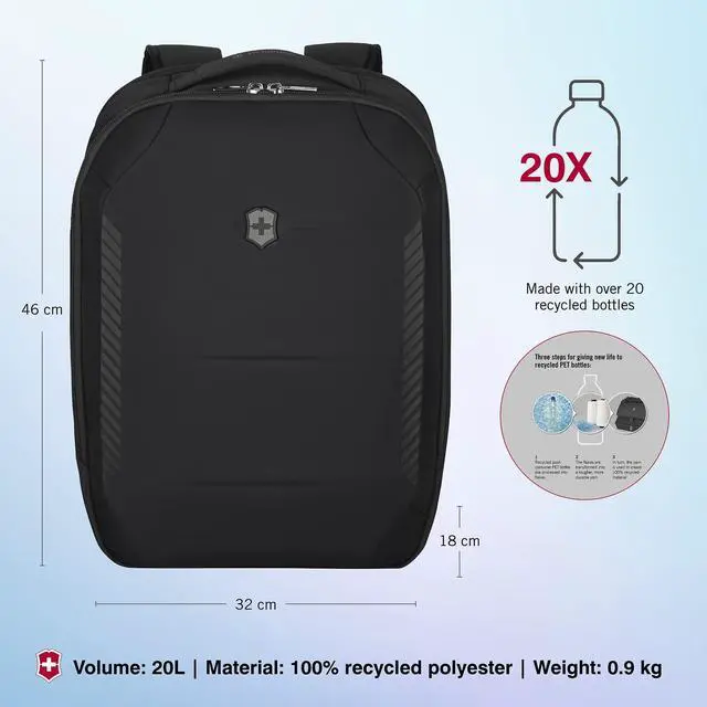 DescriptionRediscover the art of sleek, functional travel with Victorinox's Crosslight City Daypack. Lightweight yet durable, this black backpack is not just a bag; it's a mobile command center for the business professional on the go. Made from over 20 recycled PET bottles, the Crosslight City Daypack is a triumph of sustainability. The business backpack's design caters to those who appreciate a compact laptop backpack that doesn't compromise on space or security. A dedicated, padded laptop compartment ensures your device stays protected, while the heavy-duty zippers keep your belongings secure.