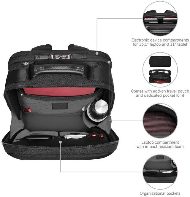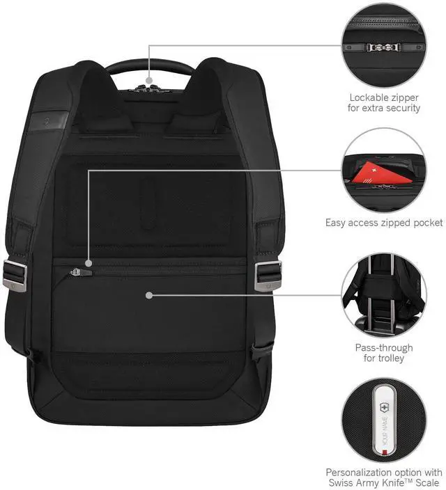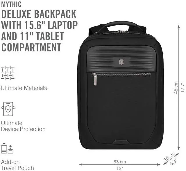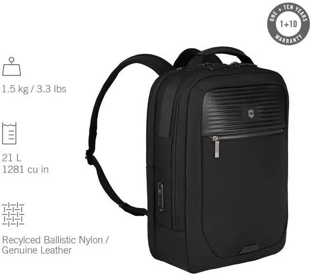 DescriptionThe Mythic Compact Backpack features interlocking zippers with leather pulls and a luggage cart pass-through with a scratch-resistant pocket for your passport, making it perfect for travel. The interior boasts a padded 14" laptop compartment with impact-resistant foam, an 11" tablet pocket and smart organization with multiple pockets for essentials. An add-on Travel Pouch provides extra storage. With branded shoulder straps and a top handle in genuine leather, this backpack combines comfort and elegance for the modern professional.