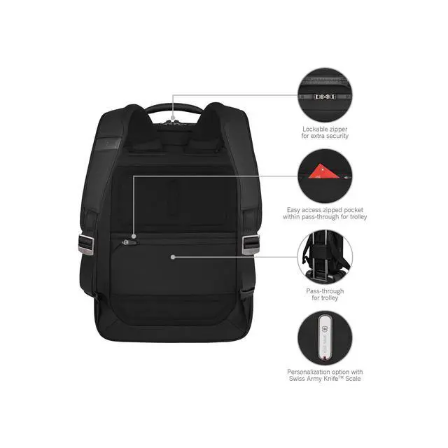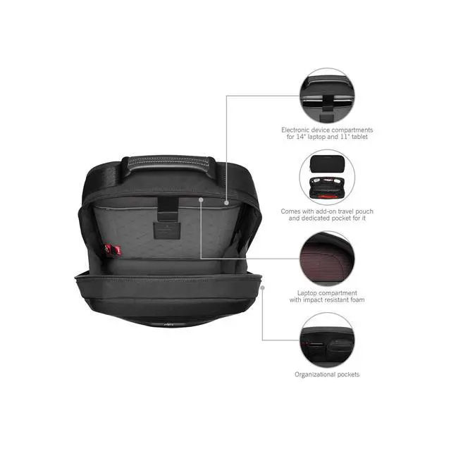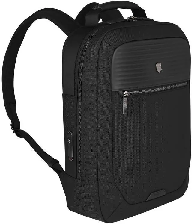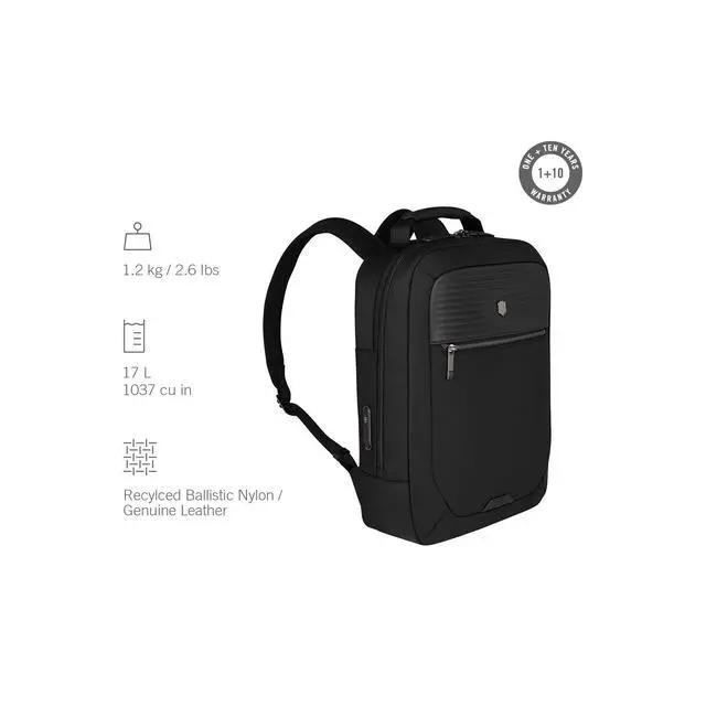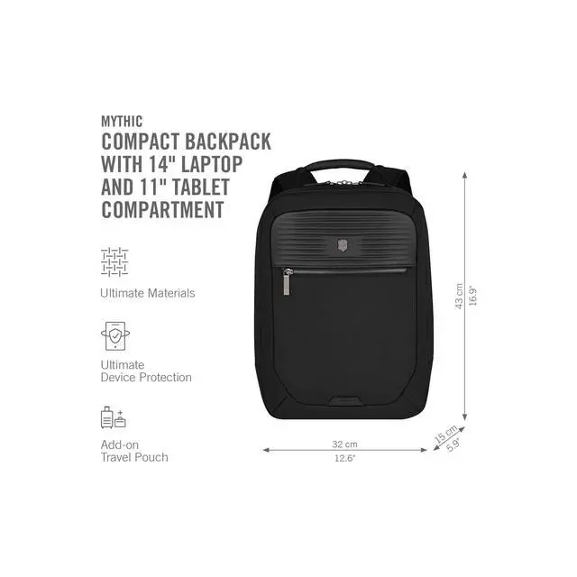 DescriptionThe Mythic Compact Backpack features interlocking zippers with leather pulls and a luggage cart pass-through with a scratch-resistant pocket for your passport, making it perfect for travel. The interior boasts a padded 14" laptop compartment with impact-resistant foam, an 11" tablet pocket and smart organization with multiple pockets for essentials. An add-on Travel Pouch provides extra storage. With branded shoulder straps and a top handle in genuine leather, this backpack combines comfort and elegance for the modern professional.