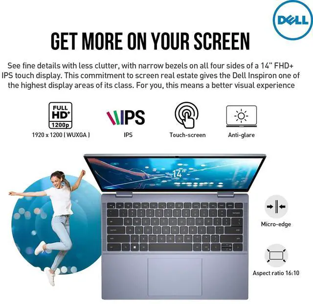 14" FHD+ IPS Anti-Glare WVA Touch, ComfortView. Wherever you go, immerse yourself in content with the roomy 16:10 aspect ratio touch screen and enjoy the details of your content with ease. AMD Radeon Graphics offers vibrant color, stunning details for images/videos