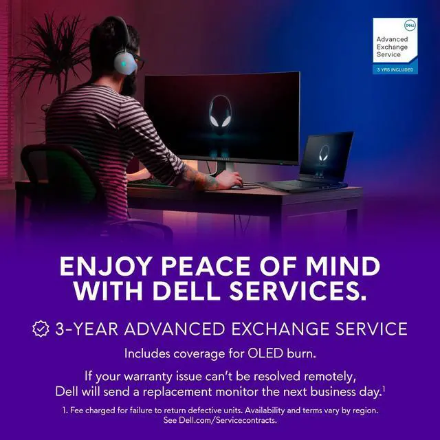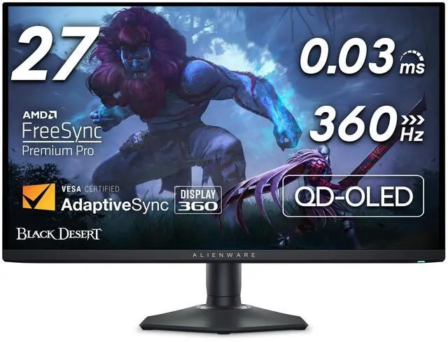 QD-OLED GAMING MONITOR (AW2725DF): The worlds first 360Hz QD-OLED* gaming is here. The AW2725DF brings together a competition-ready 360Hz refresh rate with the beautiful color and vibrance you can only get on a QHD QD-OLED panel. With infinite contrast ratio and VESA DisplayHDR400 True Black certification, you can expect rich, detailed darks and stunning brights, all in the same scene. And the 360Hz refresh rate translates to superb motion clarity, even in fast-moving games. Sleek monitor head design and minimal hexagonal base makes for an attractive centerpiece that leaves maximum space on any desktop. 3-zone AlienFX lighting evokes premium, customizable presence in your gaming setup. AlienVision overlays give players visual options to enhance their gaming performance. Fully adjustable stand promotes comfort and ergonomicsThree-year Advanced Exchange Service Warranty that includes OLED burn-in coverage.