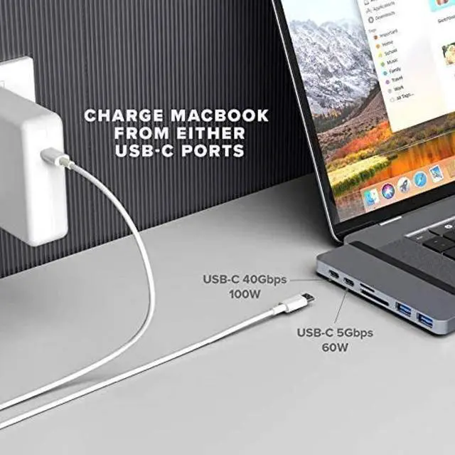 Form-fitting USB-C hub with 4K 60Hz HDMI & Magnetic Grip for MacBook Pro and MacBook Air. This USB-C docking station securely attaches to MacBook adding 7 ports: 4K 60Hz HDMI output, USB-C PD, Thunderbolt 3 compatible, and more.