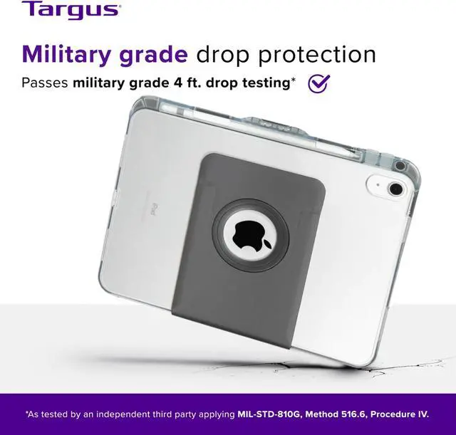 Complement your colorful new iPad with the Targus VersaVu Clear Case for iPad (10th gen. ) 10.9 -inch - a case designed for protection and versatile viewing. Featuring a shock-absorbent tray with wrap-around bezel and reinforced corners, plus a protective folio cover to safeguard the screen, the case delivers military-grade drop protection (up to 4 feet/ 1.2 meters) in its sleek design. The VersaVu's patented 360-degree rotation creates virtually any positioning option and transitions smoothly between portrait and landscape to customize your view. Deep grooves anchor the edge to ensure stability, and precision cutouts give you easy access to all your buttons, ports, and camera lenses.