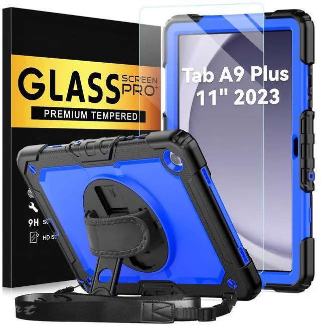 BLOSOMEET Blue Case for Samsung Galaxy Tablet A9 Plus 11 Inch 2023 with Tempered Glass Screen Protector, Pencil Holder, Kickstand, Hand Strap, Shoulder Strap