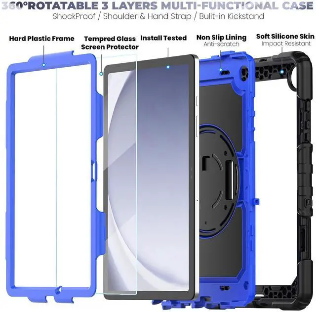360degRotatable Kickstand & Hand Strap: The built-in stand supports multi-angle viewing, making it easy for kids to watch movies, draw and study at the table.The soft rotating strap prevents the Samsung Tablet A9 Plus from falling, making it easier for teachers, students, waiters, doctors, nurses and conference presenters to use the tablet