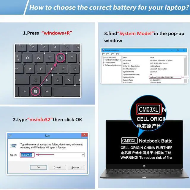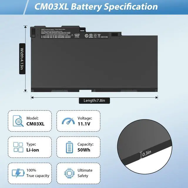 Specifications: Model Name: CM03XL Laptop Battery; Battery Type: Lithium polymer ; Voltage: 11.1 Volt; Capacity: 50 Wh; Color: Black.Package includes: 1 x CM03XL laptop battery + 1 x Instruction for cm03xl battery + installation tool (2 x free screwdriver + 1x free triangle piece, the installation tool will help you install the laptop battery easily)