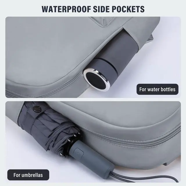 Multi-compartment design: The main compartment is equipped with a 15.6-inch padded laptop pocket, which can store books and business documents while still having room for daily necessities. The interior front pocket also holds pens, power banks, cell phones and other items. 2 elastic side pockets can hold different sized bottles and umbrellas, and the front pocket can hold some quick-access items such as tissues, cosmetics, etc.