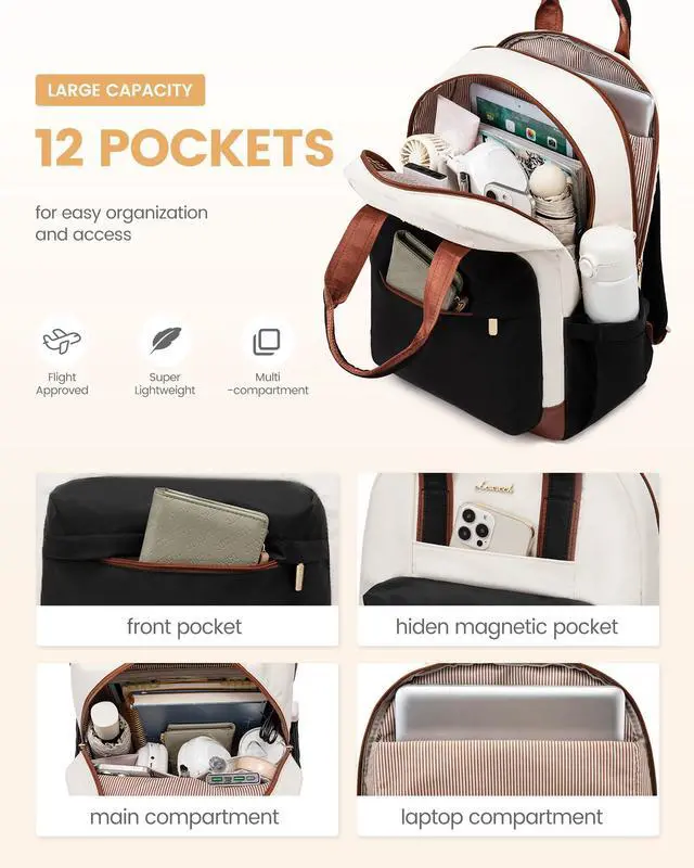 LARGE CAPACITY & ORGANIZED Size: 18.2" * 14.1" * 7.1", weight: 1.73lb. This cute backpack for women boasts 6 organized compartments, including 1 laptop compartment, 1 main compartment, 2 front pockets, and 2 side pockets for up to 15.6" laptop, Pad, notebooks, clothes, bottle, umbrella, and more.