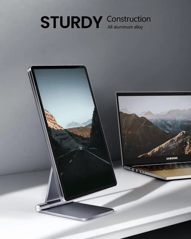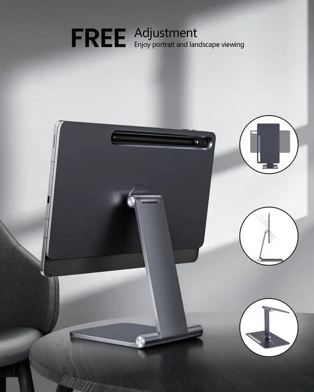 360deg Angle & Height Adjustable: This foldable desktop tablet stand has two hinges, the upper hinge adjusts the angle make you easily adjustable for portrait and landscape modes, the lower hinge adjusts the height and folded. You can easy match the best eye-level, so that you can keep a comfortable posture when Painting, Taking notes, playi