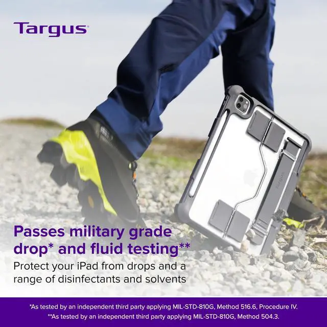 Protect your iPad without compromise with the Targus SafePort Rugged Max Case. Built to exceed military-grade standards, this case defends against drops up to 6 feet and is resistant to cleaning fluids and disinfectants, making it ideal for healthcare, education, and on-the-go professionals. It features an integrated screen protector, reinforced corner bumpers, and a clear back that showcases the device while allowing asset tag scanning. A kickstand offers convenient landscape viewing, while the adjustable silicone hand strap enhances portability and grip. Covered ports and an integrated stylus holder round out a case built for real-world demands.