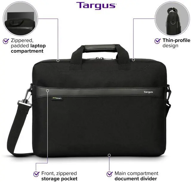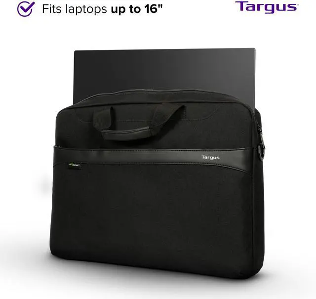 Stay organised and stay ahead with the 15-16" GeoLite EcoSmart® Slim Brief. Sporting a modern design, it's ideal for professionals looking to balance style, storage, and laptop protection. Slimmer than a briefcase and more functional than a sleeve, the GeoLite EcoSmart® Slim Brief offers a divided laptop compartment allowing for a separate space for documents and files. The front zip compartment provides easy access to your phone, charger, and other accessories. Its removable shoulder strap, soft-grip handles, and luggage trolley strap offer comfortable carrying options. And, its water-resistant exterior and earth-conscious interior, deliver on style, functionality, and sustainability.
