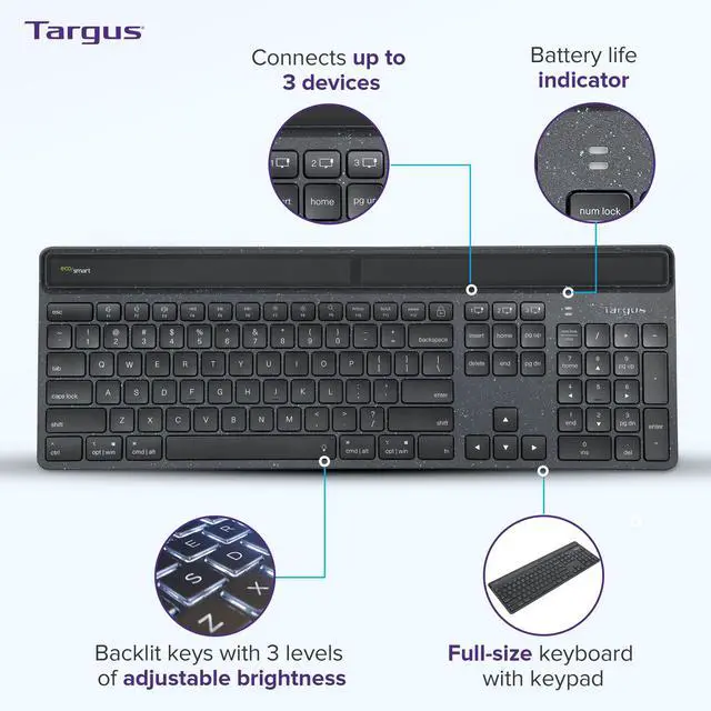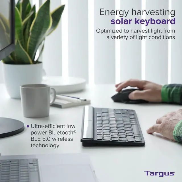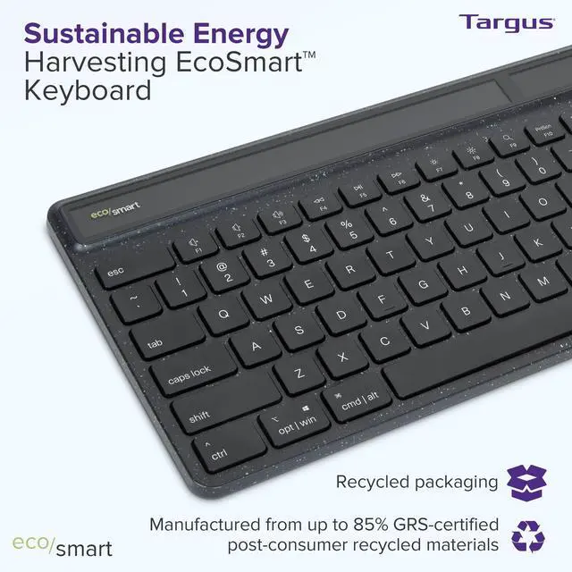 Introducing the Targus Sustainable Energy Harvesting EcoSmart Keyboard, the wireless keyboard solar-powered keyboard that provides you with the efficiency you need without compromising on quality. This slim, yet durable keyboard is manufactured from up to 85% post-consumer recycled materials. One of the key features of the Targus Sustainable Energy Harvesting EcoSmart Keyboard is its efficient energy harvesting solar technology that is optimized for a variety of light conditions. Whether you are in a brightly lit office or working in dimly lit environments, this wireless keyboard solar will provide you with the energy you need to work comfortably.