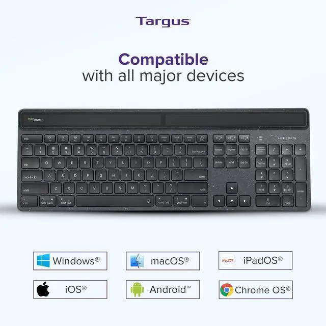 Additionally, the keyboard has a rechargeable 1600 mAh lithium-polymer battery that can be charged via USB-C cable (included), making it easy for you to recharge the keyboard's battery when needed. The Targus Sustainable Energy Harvesting EcoSmart Keyboard comes with backlit keys that offer three levels of adjustable brightness, making it easy for you to work comfortably in any lighting environment. Additionally, this keyboard comes with a limited 2-year warranty. This keyboard is compatible with Chrome OS, Windows, macOS, iPadOS, iOS, and Android, making it the perfect choice for those who use a variety of devices.