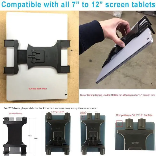 • To fit iPad Pro, please slide in the 4 longer hooks first then expand the strong spring loaded holder to slide in your tablet in landscape position first. Once locked in to holder, you can then rotate adjust the tablet into portrait position (Please check the ima