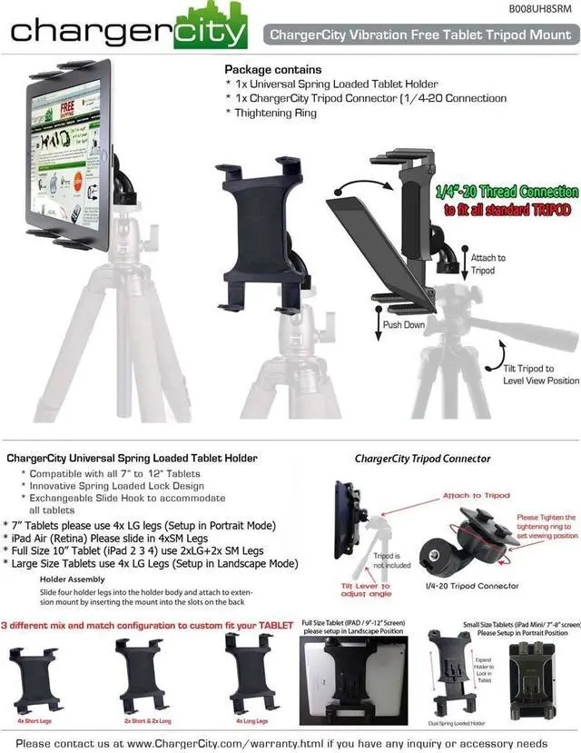 ChargerCity Tripod mount allows easy mounting and positioning of your tablet (7 to 12 inch Screen Size Tablet, Ipad PRO Air Mini (Retina) Samsung Galaxy Tab Microsoft Surface Pro/Book Google Nexus Tablet on to your Tripod. Use it anywhere you desire (Periscope Live Streaming Recording Youtube, Wedding, Party, Meetings, sporting events golf swing practice app). Our innovative yet simple mounting solution not only is COST EFFICIENT but easy to install and use (No Tools required). ** THIS MOUNT IS ONLY INTENDED FOR TABLETS, IT IS NOT COMPATIBLE WITH LCD MONITOR SCREEN OR NOTEBOOKS **For Fit iPad ProTo fit iPad Pro, please slide in the 4 longer hooks first then expand the strong spring loaded holder to slide in your tablet in landscape position first.