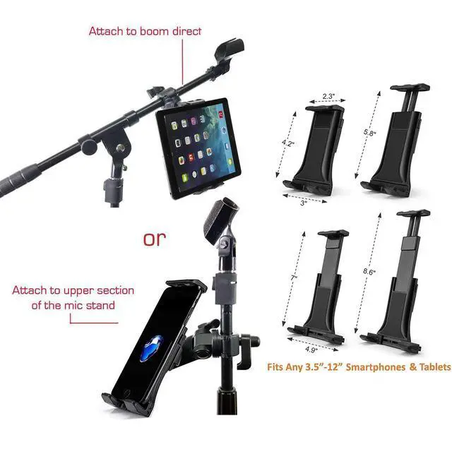• New innovative, Universal Microstand Mount will allow you to sit your Smartphone or Apple MINI Pro Air Galaxy Tab 7 Surface & other 7-13 inch screen Music Tablet directly on to your Mic microphone stand Post (Stand is sold separately)