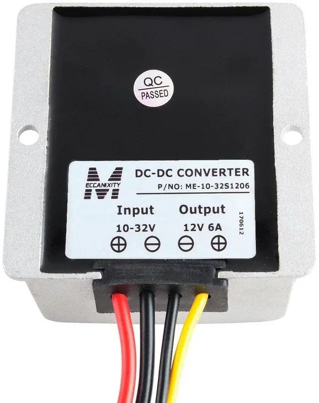 DC 12V 6A 72WFeatures: 1. 100% full power and stable current output, non-isolated module. 2. Waterproof level IP68 and anti-shock protection, ultra-compact size, lightweight. 3. Industry-grade DC10-32V to DC 12V converter, efficiency up to 90%. 4. Die-cast aluminum shell, epoxy potting, cooling by free air convection. 6.