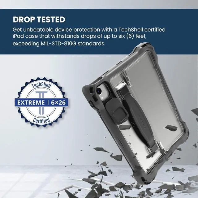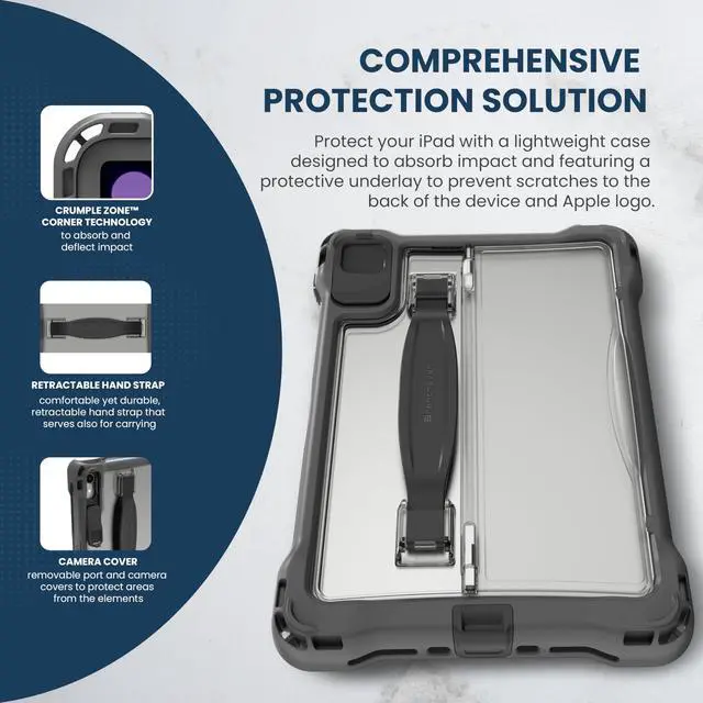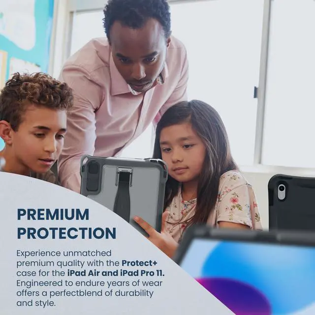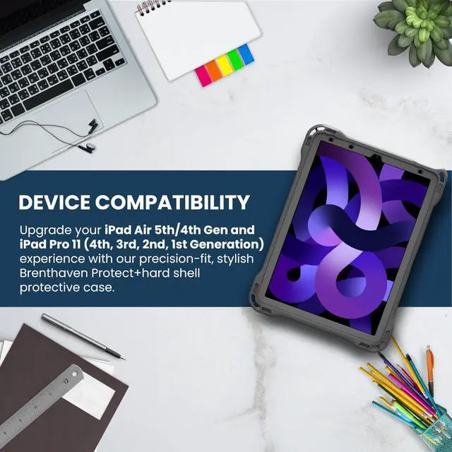 Protect+ for iPad Air (4th, 5th Gen) and iPad Pro 11-inch (2nd, 3rd, 4th Gen) combines Brenthaven's trusted device protection featuring Crumple Zone Corner technology and ruggedness to withstand six (6) foot drops, with Brenthaven's revolutionary, cable-free, charging station, Power5. Our quick-install case, with the addition of the Cable-Free Adapter (sold separately) and Power5 Charging Station means you can cut cables for good and simplify iPad device charging. With features like an optional screen protector, camera and port covers to protect delicate features from the elements, and an infinitely adjustable kickstand, you can be confident that Brenthaven's Protect+ Case for iPad Air and iPad Pro provides premium protection, top-of-the-line features, and is exclusively compatible with our Power5 Charging Station and patented Cable-Free Adapter.