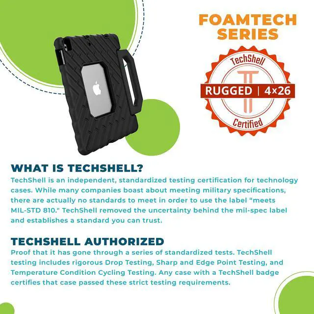 PRIME PROTECTION BUILT FOR KIDS - Our FoamTech iPad case is made with durable EVA foam co-molded with high impact PC (polycarbonate) making the case lightweight and form-fitting yet rugged for standard maximum bump and drop protection. Exceeding MIL-STD-810G standards, with rigorous testing for drops of up to six (6) feet, this case is DROP TESTED TechShell certified, ensuring your tablets stay secure and intact, deals with everyday conditions. Comes in variety of colors, blue, lime green and orange.