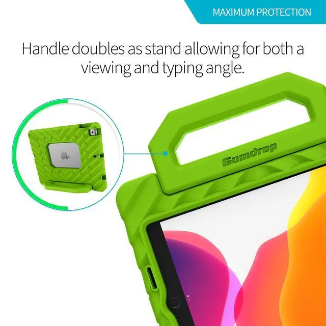 Exceeding MIL-STD-810G standards, with rigorous testing for drops of up to six (6) feet, this case is DROP TESTED TechShell certified, ensuring your tablets stay secure and intact, deals with everyday conditions. Comes in variety of colors, blue, lime green and orange. ^^ ENTERTAINMENT AND FUNCTION - Crafted to seamlessly blend entertainment and functionality, this iPad Generation cover offers an INTEGRATED HANDLE that transforms into a stand with ease, whether you're watching movies, streaming, typing, gaming or reading. Perfect for those with active, on-the-go lifestyles, especially for kids.