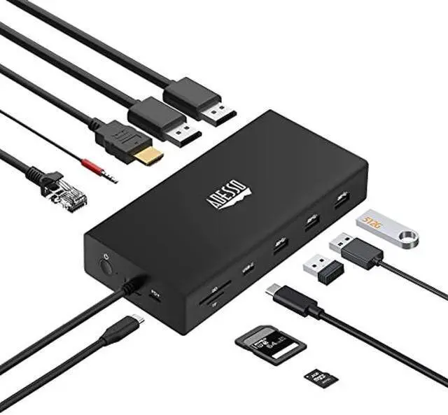Expand the connectivity on your Windows, Mac, Chrome, or Android system using the 12-in-1 USB-C Multi-Port Docking Station from Adesso. This dock features one USB-C port with up to 100W of power delivery, one USB-C 3.2 Gen 1 port, three USB-A 3.2 Gen 1 ports, dual DisplayPorts, and one HDMI port that support up to three displays, a Gigabit Ethernet port for network connectivity, a 3.5 mm audio combo jack, and dedicated SD and microSD (TF/TransFlash) media card slots. Power is established using an integrated 39.4" USB-C cable and an included 100W power adapter.