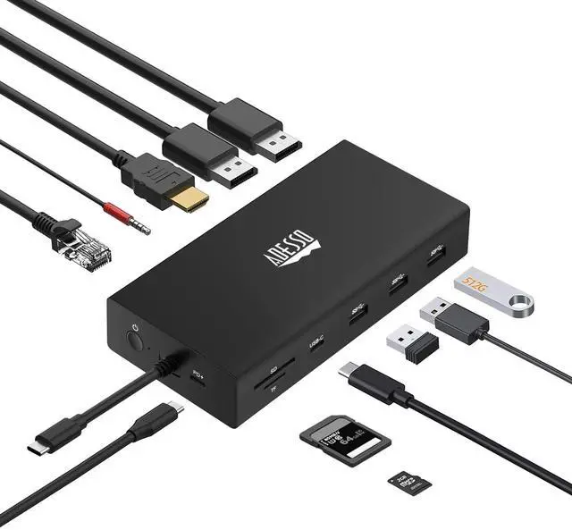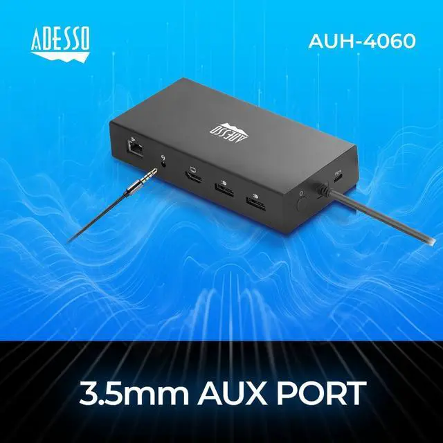 Expand the connectivity on your Windows, Mac, Chrome, or Android system using the 12-in-1 USB-C Multi-Port Docking Station from Adesso. This dock features one USB-C port with up to 100W of power delivery, one USB-C 3.2 Gen 1 port, three USB-A 3.2 Gen 1 ports, dual DisplayPorts, and one HDMI port that support up to three displays, a Gigabit Ethernet port for network connectivity, a 3.5 mm audio combo jack, and dedicated SD and microSD (TF/TransFlash) media card slots. Power is established using an integrated 39.4" USB-C cable and an included 100W power adapter.