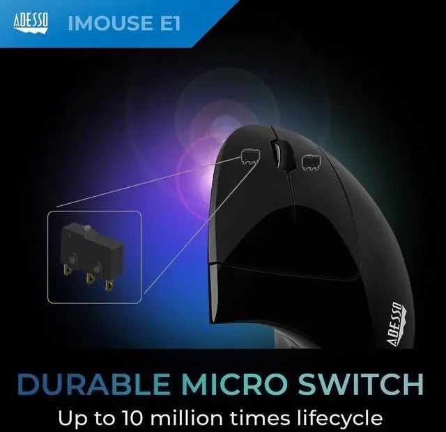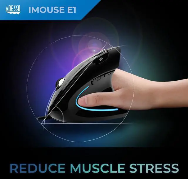 This iMouse E1 Illuminated Vertical Ergonomic Mouse is designed with a vertical orientation and a contoured shape that provides a uniquely comfortable user experience. With this wrist-friendly contour support, you will hold your hand in a "handshake position" which is the neutral position of your forearm. This feature prevents your forearm from twisting when using this vertical ergonomic mouse. Featuring two ergonomic buttons that are located conveniently on the side of the mouse allowing seamless back and forth browsing. The 1000/1600 switchable DPI control provides two levels of mouse cursor speed that works in different environments.