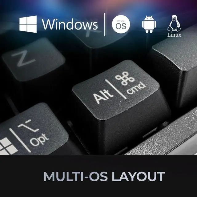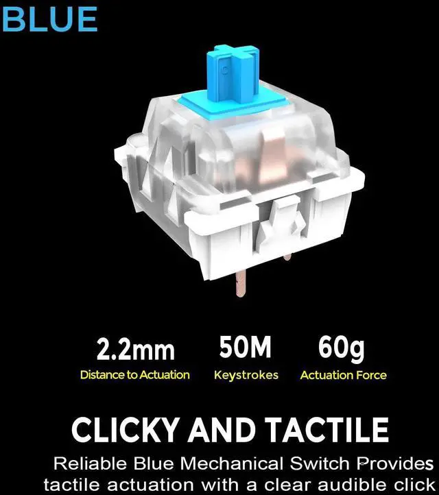 Mechanical Switch Advantage - Experience the tactile and audible satisfaction with our keyboards blue mechanical switches. Feel the difference with each keystroke, ensuring a responsive and comfortable typing experience that lasts with a 50 million keystroke lifecycle. ^^ 2X Size Large Print Keys - Our keyboards large print keys are not only easy on the eyes but also provide excellent contrast, making it ideal for those who struggle with traditional small print. The 2X size ensures greater visibility and ease of use. ^^ Multi OS Layout - Versatility at its best! Our keyboards multi-OS layout feature allows seamless switching between operating systems.