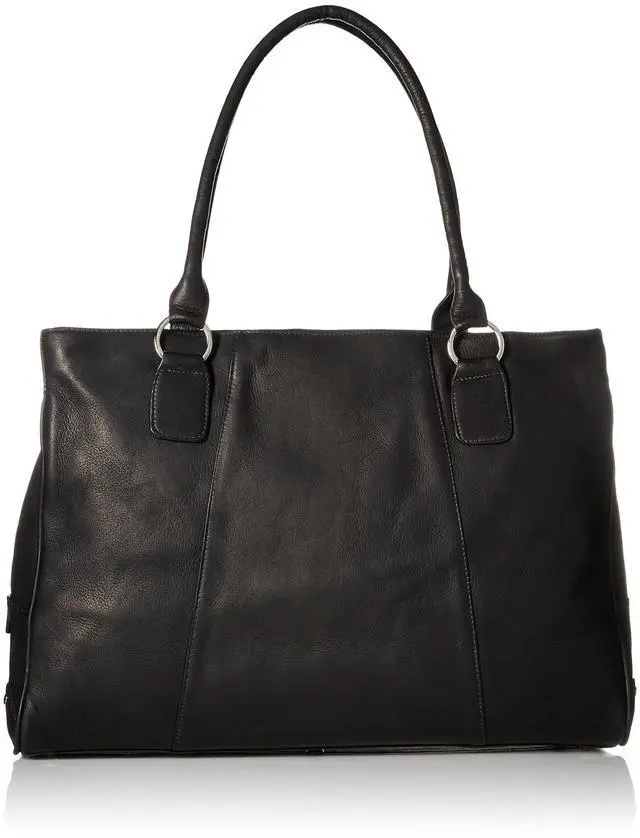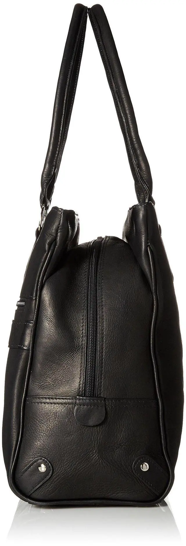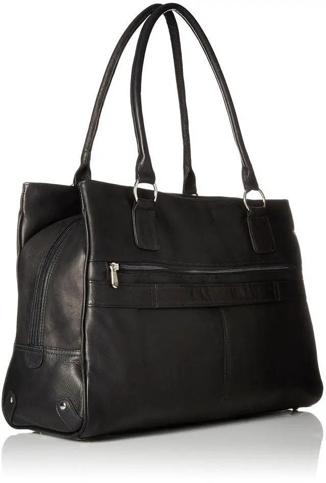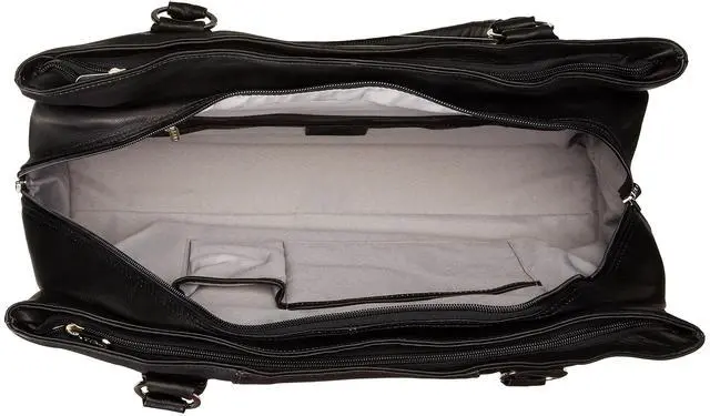 Large spacious main compartment in the center with an interior zip-pocket, phone pocket, and flat open pocket. Rear padded compartment with laptop pocket. Front zip-compartment, rear zip-pocket, dual padded straps, and a back strap to attach to a telescopic handle.