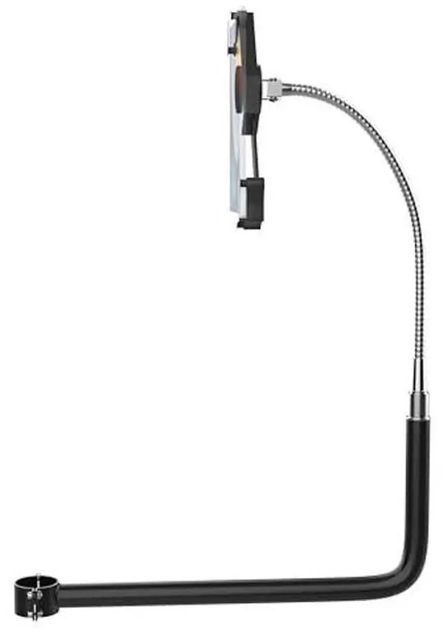 This rugged chair mount is ideal for medical waiting rooms, airports, hotel lobbies, check-in stations, or any place requiring a permanent tablet solution for seating areas. The bracket mounts to the center pole of office chairs or round legs via included Allen Key screws and quickly clamps in place. This base extends a generous 15 inches before curving straight up 6 inches. A thin, 15.5 -inch gooseneck attaches and tightens via butterfly screw. The gooseneck allows for virtually limitless angle adjustments, as well as rotation for use in either portrait or landscape orientation.