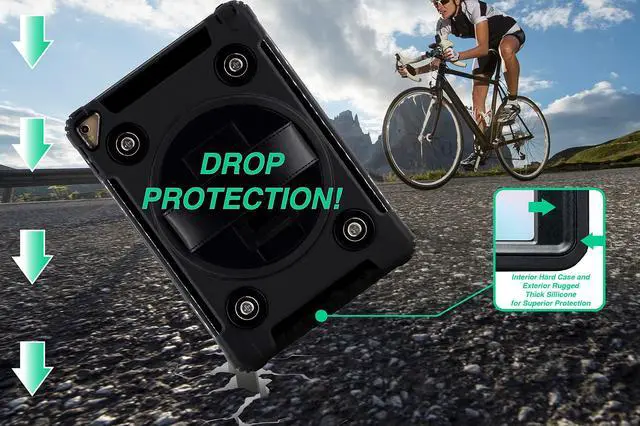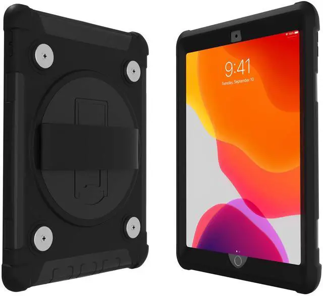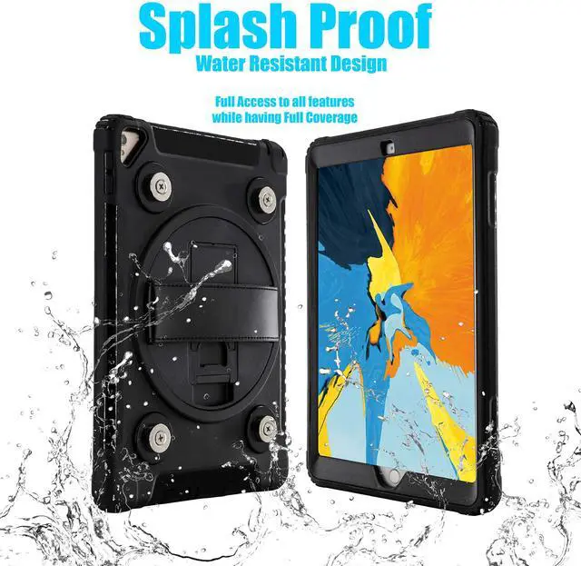 Features: Water-resistant design Military Grade Certified (MIL-STD-810G) Screen Protector Durable impact shielding Full access to charge port, speakers, and home button Embedded magnets on case rear allow quick mounting to any metal surface 2 sizes of metal plates with adhesive backing for fast mounting setups anywhere Perfect for refrigerators, file cabinets, classroom walls, and more Compatible with iPad Air2, iPad Gen. 5 (2017), iPad Gen. 6 (2018), iPad