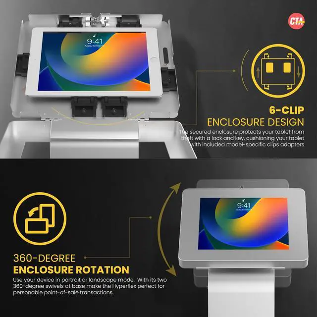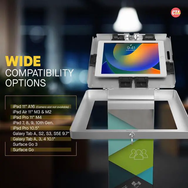 The Locking Floor Stand Kiosk from CTA Digital makes your tablet the centerpiece of a protected standing workstation. The padded enclosure protects your tablet from theft with a lock and key, cushioning your tablet with included model-specific foam adapters. The enclosure is designed to allow full access to your tablets charge ports and front camera. The enclosure also rotates a full 360 degrees for portrait and landscape displays. Standing 50 inches tall, this heavy-duty floor stand boasts a hollow interior for clean charge cable routing, plus a weighted base equipped with slip and scratch resistant padding.