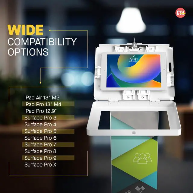 The Locking Floor Stand Kiosk from CTA Digital makes your tablet the centerpiece of a protected standing workstation. The padded enclosure protects your tablet from theft with a lock and key, cushioning your tablet with included model-specific foam adapters. The enclosure is designed to allow full access to your tablets charge ports and front camera. The enclosure also rotates a full 360 degrees for portrait and landscape displays. Standing 50 inches tall, this heavy-duty floor stand boasts a hollow interior for clean charge cable routing, plus a weighted base equipped with slip and scratch resistant padding.