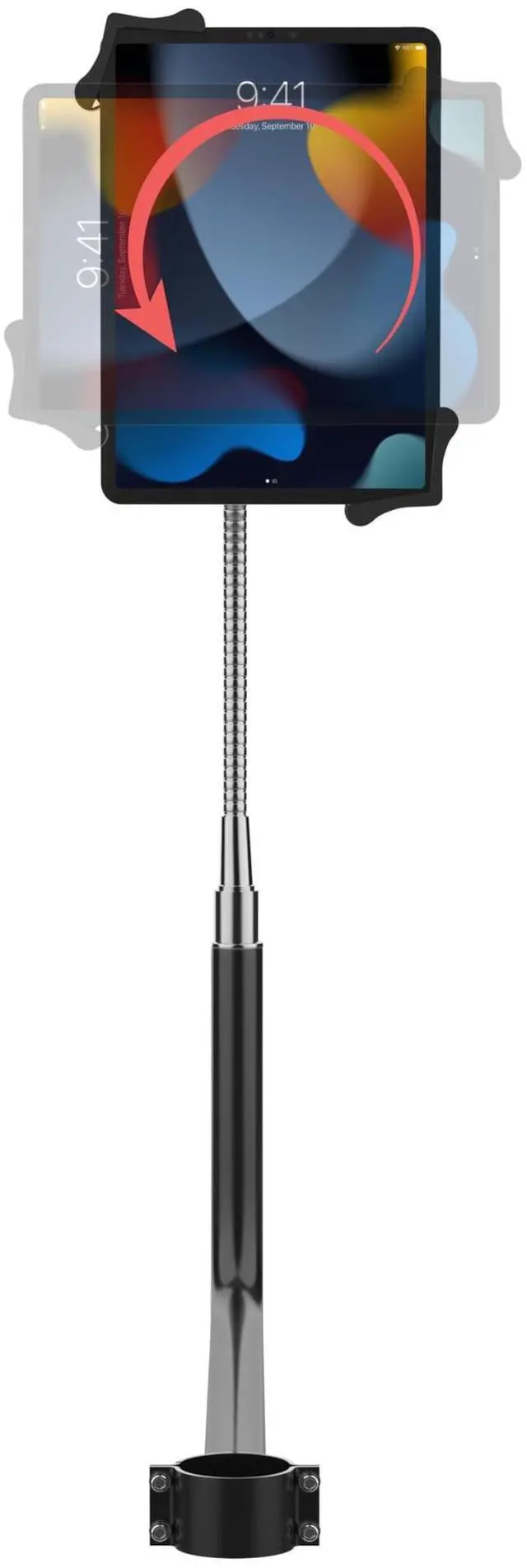 {COMPATIBILITY} iPad 10.2 -inch 7th/ 8th/ 9th Generation - iPad Air 3 - iPad Mini 5 - 12.9 -inch iPad Pro - 11-inch iPad Pro - iPad Gen 6 - iPad Pro 12.9 -inch - iPad Pro 9.7 -inch - iPad Gen 5 - Galaxy Tab S2 9.7 -inch & Other 7-13-inch Tablets & Headphone Jack Credit Card Readers. ^^ {STURDY} Sturdy black metal bracket with flexible gooseneck and universal tablet holder provides a durable and adaptable solution for your tablet display needs. ^^ {ROTATABLE} Holder rotates 360 degrees for use in portrait and landscape orientations, offering flexible viewing options to suit your preference.