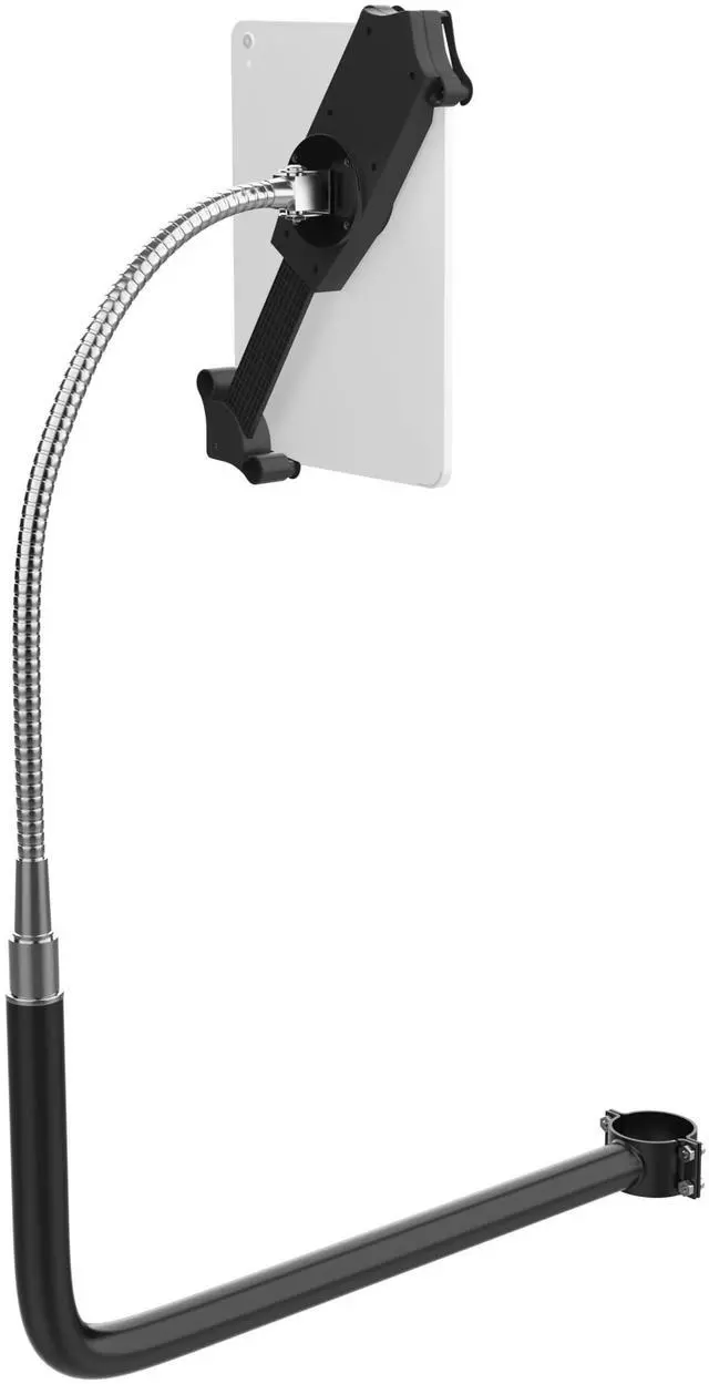 {STURDY} Sturdy black metal bracket with flexible gooseneck and universal tablet holder provides a durable and adaptable solution for your tablet display needs.