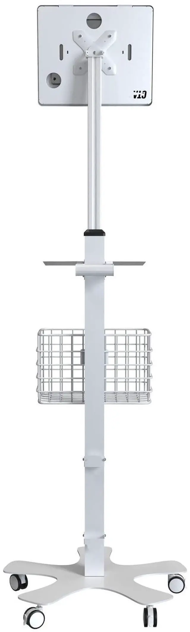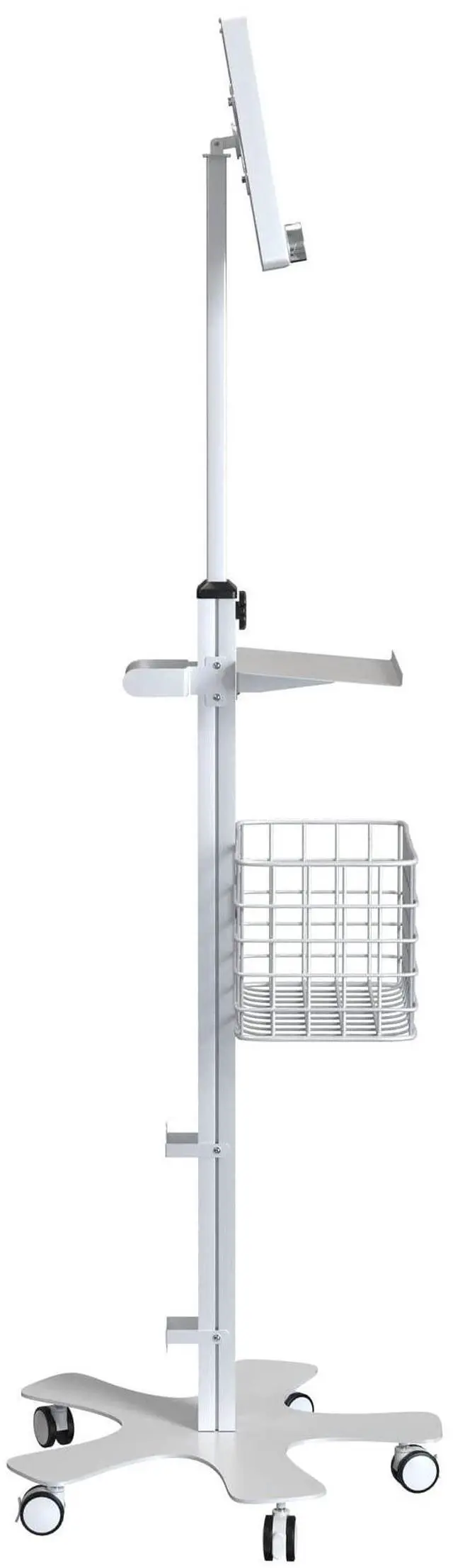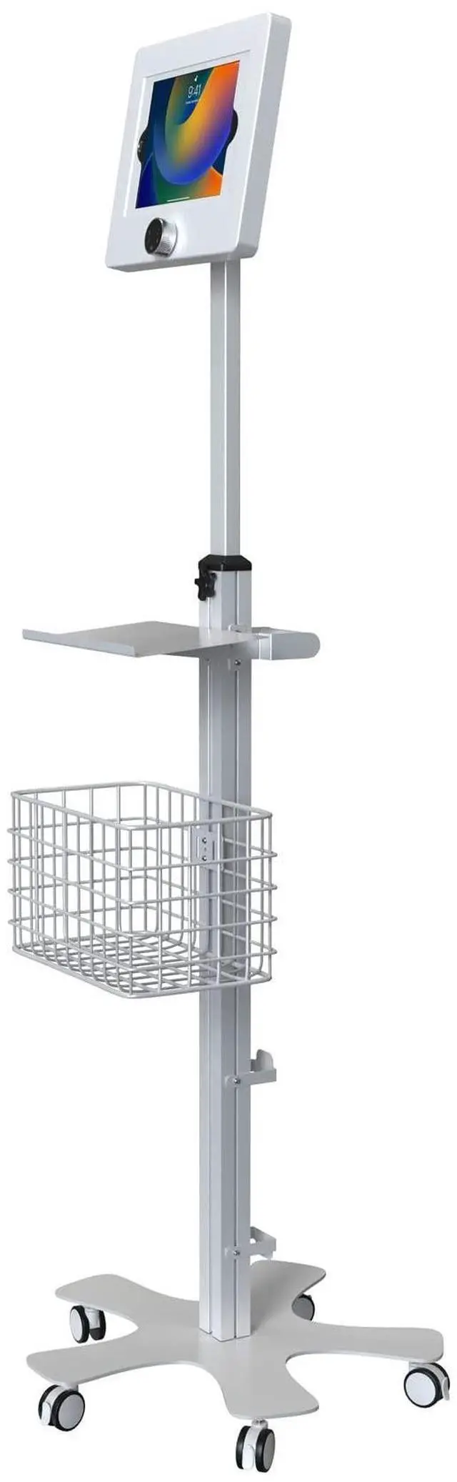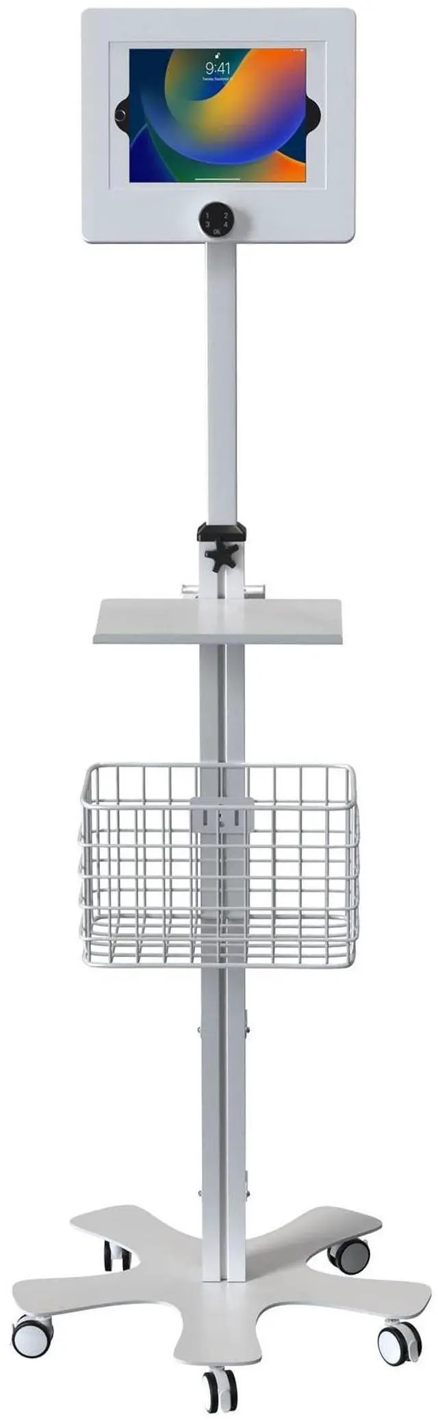 The base features five smooth-rolling casters that can be locked in place with a simple toggle switch. The stand includes a navigation handle, attachable keyboard tray and handy basket. Two brackets at the base of the stand provide a safe place to route cables. The enclosure is compatible with iPad 10th Gen 10.9, iPad 10.2 -inch (7th, 8th, 9th Generation), iPad Pro 10.5, and iPad Air Gen 3 (other 9.7 -11" tablets by special order request).