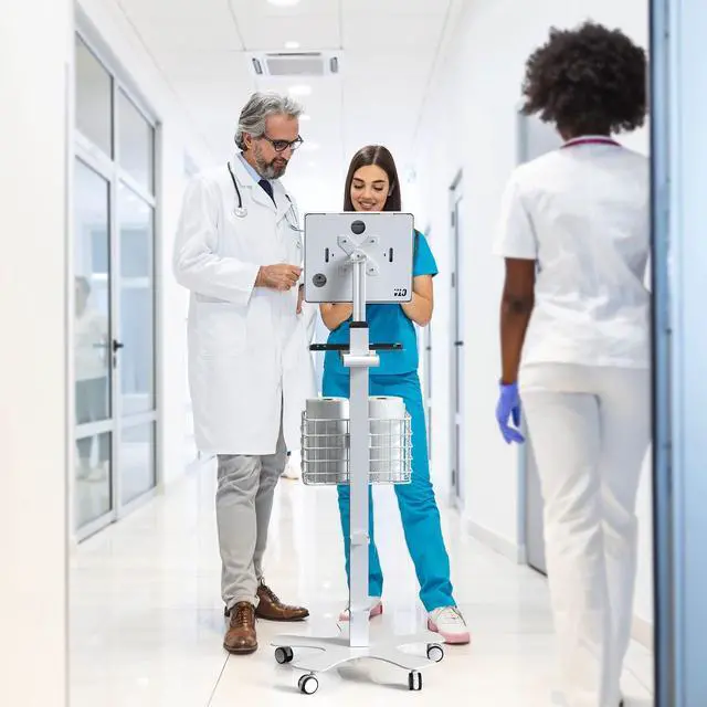 Whether you need a sturdy, height-adjustable floor stand with a locking enclosure for a busy doctors office, nurses station, education program, or hospital, CTAs Medical Floor Stand & Digital Password Enclosure holds everything you need. The enclosure features a rechargeable digital lock on the front that provides visual protection in public spaces. Instead of easy-to-misplace keys, this lock opens with a programmable 4-digit code. To charge, plug the lock directly into the wall. The metal mount has a padded base that protects surfaces Youll find plenty of space to route cables through the interior.