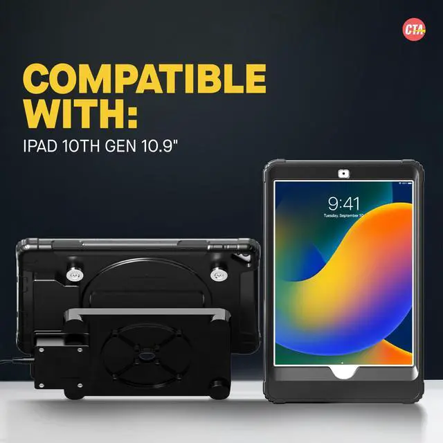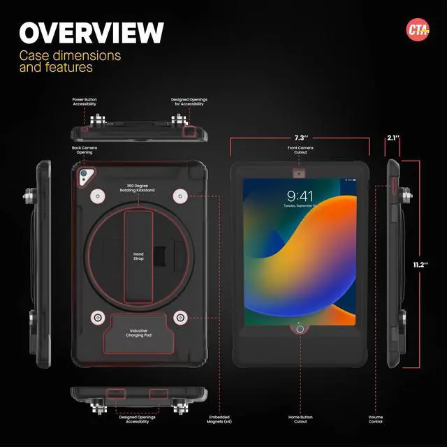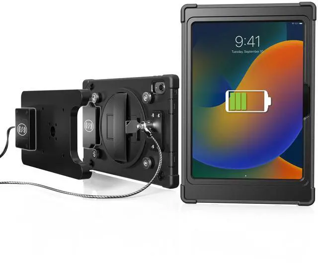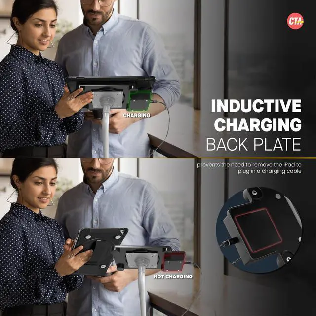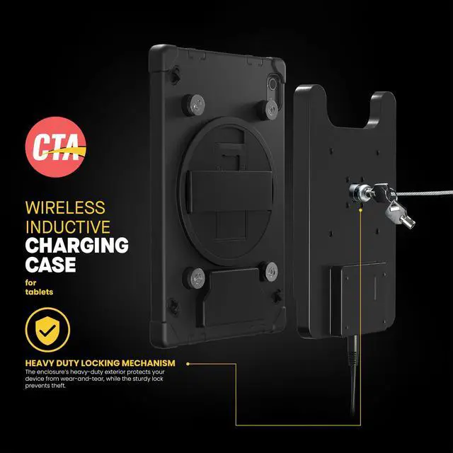 CTA Digitals Wireless Inductive Charging Case with Security Lock is a game changer for iPad 10th Generation users. This case exceeds the functionality of normal cases, as first and foremost, it has enhanced security AND wireless charging. The inductive charging feature makes messy charging cables an issue of the past. Plug the induction docking station into an outlet with the included A/C adapter and assemble the tablet inside the case. Place the case on the dock via 4 powerful magnets. As soon as its properly aligned, an inductive field automatically charges the iPad on contact.