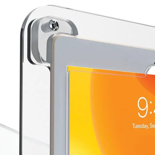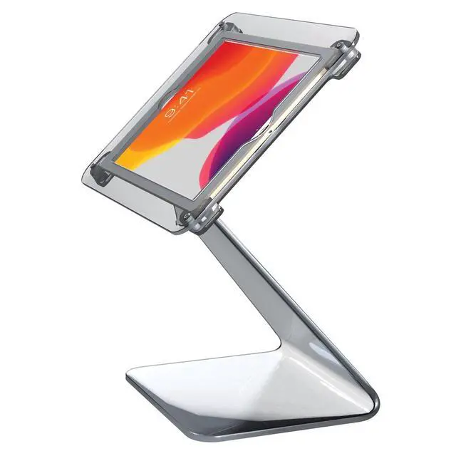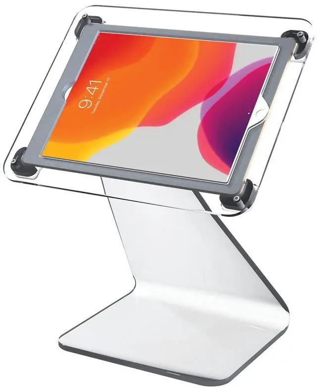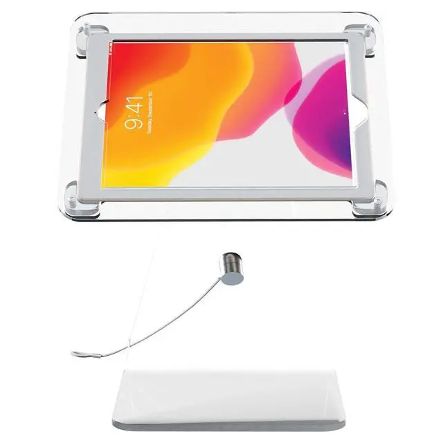 Features: Heavy-duty locking enclosure protects tablet from theft Smooth front to back angle adjustment, perfect for point of sale transactions Acrylic base with scratch and slip resistant rubber grips Optional steel security cable tethers stand to any permanent fixture Cable routing through the back of the Enclosure Compatible with iPad 10.2 -inch (7th & 8th Generation), iPad Air Gen. 3 & iPad 10.5.