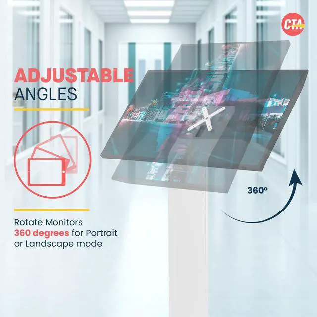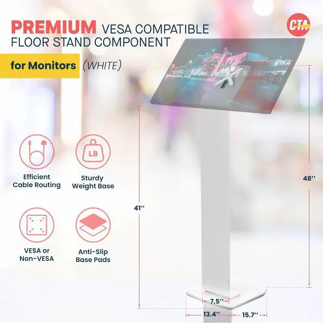 The Floor Stand Kiosk from CTA Digital makes your tablet or any VESA Standard mount the centerpiece of a Heavy-Duty standing workstation. Standing 50 inches tall, this heavy-duty floor stand boasts a hollow interior for clean charge cable routing, plus a weighted base equipped with slip and scratch resistant padding.
