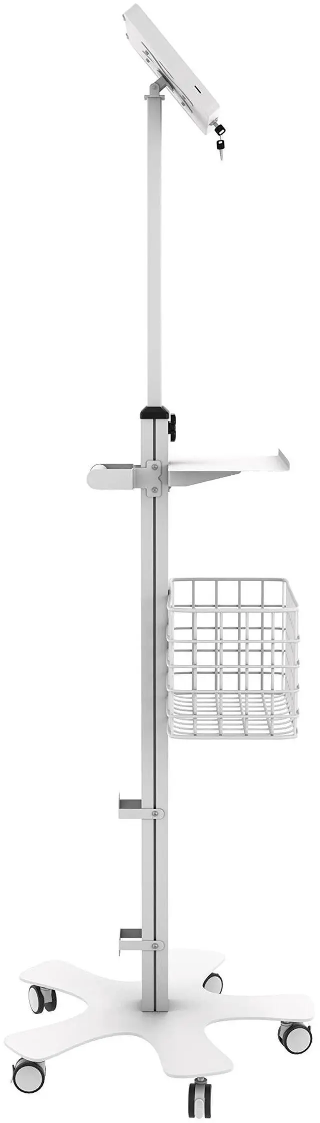 Whether you need a sturdy, multifunctional floor stand for healthcare, retail, hospitality, or events, CTAs Mobile Floor Stand holds everything you need. Included in this kit is our bestselling Paragon Premium Locking Enclosure (PAD-PARAW), which provides a secure, sloped tablet mount with enough room underneath to safely hide peripheral power banks or USB hubs. The sturdy base is comprised of five smooth-rolling casters that can be locked in place. The stand includes attachable keyboard tray and handy basket, all easily affixed with included mounting kit. At the rear of the unit, youll find a useful handle, which aids in simple navigation.