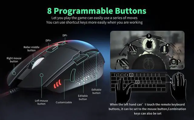 ^^ Programmable Mouse: 8 programmable buttons are all editable. Including forward/backward side buttons, allowing for effortless navigation and increased productivity. Perfect for gaming, browsing, or multitasking.