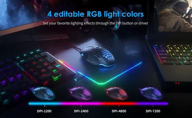 ^^ Vibrant Backlight: The flowing backlight mode of the LED Wired Mouse creates a visually stunning environment and illuminates your workspace, adding a vibrant atmosphere. ^^ 6 DPI Options for Games & Work1200/1600/2400/3200/4800/7200 DPI Resolution Optical Tracking Technology provides sensitivity and precise tracking on a wide range of surfaces. Meet your multiple needs, either for daily work or gaming. ^^ 8 Programmable Buttons Mouse GamerCYD Gaming mouse wired equips 8 programmable buttons that allow you to customize tactical buttons for any game or job. Adjustable DPI, polling rate, RGB, and macro editor, meets for your different needs, so that you have a fast speed when playing games and office.