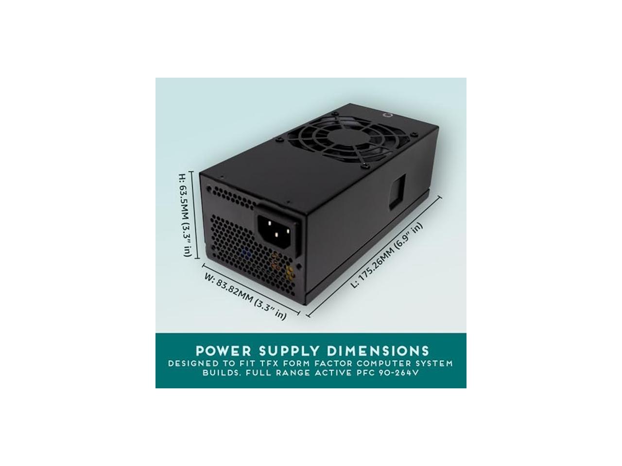 - APEVIA TFX-PFC500W Standard 500W TFX Form Factor ATX Power Supply. Full Range Active PFC 90-264V. Maximum Power: 500W.