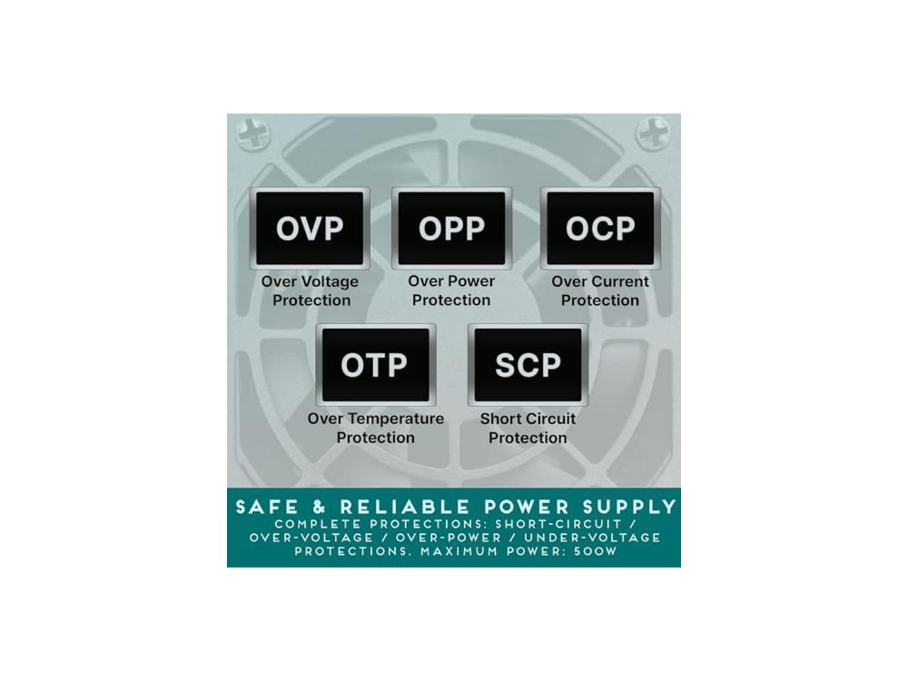 - Cooling: Forced Air Ventilation by 1 x 80mm Fan. Various protections including: Overvoltage Protection (OVP), Overload Protection (OLP), Overcurrent Protection (OCP), Heating Protection (OTP), and Short Circuit Protection (SCP)